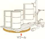 | ■特長 ドラム缶のパレット積み作業が楽に行えます。 狭い場所では、パレットを回転させる道具「マワール」をご使用下さい。 一定方向からの積み降ろしができ便利です。 よりパレットの奥へドラム缶を置けるようになりました。 (1200角のパレットの場合)