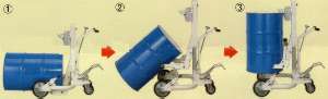 | ■特長 ねかせてあるドラム缶を独特のフォークで軽々と立ち上げることができます。 作業者を腰痛などから解放します。 ![]() ①ペダルを踏むとフォークが上昇し、ドラム缶が起き始めます。 ②ドラム缶の重心位置を超えると自立します。 ③フォークをたたみ、ドラム缶をチャックして運搬して下さい。 注)すべりやすい路面では行わないで下さい。足をはさまれないよう注意して下さい。