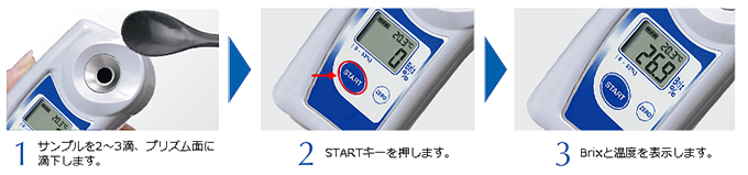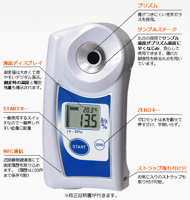 | ■特長 ●器械全体がいつでもきれいに保てる衛生設計 サンプルステージ周辺はサンプルがこぼれにくく拭き取りやすい造形美。 ●水洗い可能な防水仕様 プリズムや本体を直接、水で丸洗いOK。誤って水に落としても浮く安全設計。 ●屋外での測定にも安心のELI機能 強い外光は、本器のプリズムを通ってセンサーまで迷い込み、正しい測定を妨げます。本器に直接の強い外光が検知された際はELI機能「nnn」を表示する安心設計を採用。 ●温度に合わせて測定値を補正するATC 環境に応じ、自動的に測定値の補正が行なわれる機能を見直し、徹底改良。世の中にない機構(特許取得済)を実現。環境温度やサンプル温度が変化しても、気にせずにそのまま表示値を読むことができます。 ●かざすだけでデータ転送ができるNFC(近距離無線通信) Androidスマートフォンまたはパソコンに接続した非接触ICカードリーダー/ライターにタッチするだけで測定履歴(最大100件まで)を読み出すことが可能。 ※Nマークは、 NFC Forum, Inc. の米国その他の国における商標または登録商標です。 ■用途 飲料、野菜、果物、洗浄液、水溶性切削油、ケチャップ、醤油など ■各部名称 ![]() ■測定方法 ![]() ■仕様