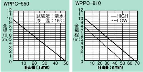 ●密閉モーターの採用により用途が拡大。 ●高効率インペラーの採用により高揚程を実現。 ●出力アップにより余裕運転。 ●コンパクト型のモーターの使用により軽量化。 ●抜群の耐蝕、耐電性。 ●安全性向上。 ●ヒューズ・保守不要。 ●流量2段切替(WPPC-910) |