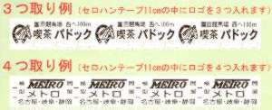 ■仕組 1 市販の透明なセロハンテープを右側にセットします。 2 文字・ロゴマークなどが彫りこんであるローラーを左側にセットします。 3 にじまない、特殊粉末インク入りタンク。 4 セロハンテープを引っ張るだけで、オリジナルテープの出来上がり.。 ![]() ■使用例 ●印字例 1つ取りから4つ取りまであります。 ![]() ●インクは次の茶金・緑・金・ピンク・黒からお選び下さい ■仕様