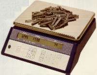 | ■特長 ●どこでも使える2電源方式 AC100V,乾電池(単一乾電池6本)どちらでも使用できます。 ●省電力設計 (マンガン乾電池で500時間,アルカリ乾電池で1000時間使用可能) ●多種類のサンプル測定に便利な6つの個別メモリー装備 ![]() ■簡単な使い方 ①基準となる試料を載せます(10個以上) ![]() ②載せた数をキーインします。 単重値(1個当たりの重さ)が記憶されます。これで単重設定完了です ![]() ③あとは載せるだけ。試料を載せるとその個数が表示されます。 ![]() ■ディスプレー 個数と重量表示、単重値が一度に読めます