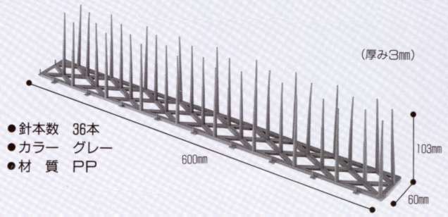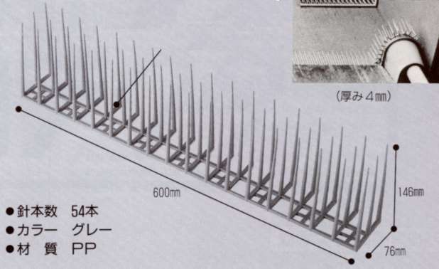 | ■特徴 ●本品はプラスチック製ですので、鳥を傷つけることはありません。鳥への配慮を忘れず、建物を美しく守ります。 ●簡単に連結して広げられますので、広い面積でも自在に対応出来ます。 ●切断などの加工が簡単に出来ますので、広い面積でも自在に対応出来ます。 ●薬品などと異なり、取り替える必要が無く、長期的に使用出来ます。 ●重量が軽く、高い所や施工が困難な場所も、楽に対応出来ます。 |