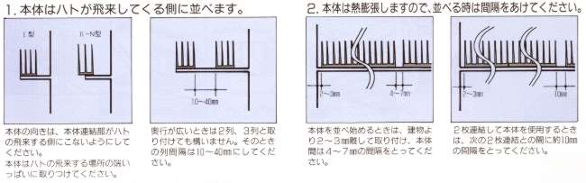 @昼によくハトが止まる場所と、夜、ねぐらにしている場所を確認して設置して下さい。 A鳥のフンがおちているところを調べ、そのうえの部分(屋根などには必ず設置するようにして下さい。 B施工場所のフン、ゴミ、ホコリ等をきれいに掃除して下さい。 C各種止め具と本体との間に余裕(アソビ)が保てるように固定して下さい。 D接着の場合、止め具接着面の油、手あか等がつかないよう清掃して下さい。 E上記事項を配慮の上、施工場所に適した止め具を選んで固定して下さい。 |