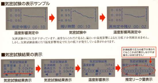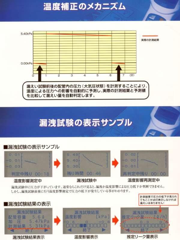 | ■特長 ●温度による圧力への影響を自動的に補正し、漏えいがある場合のみ推定リーク量のレベルメーターが点灯します。 ●法規に基づき配管容量を自動計算します。 内臓された高性能ポンプにより自動加圧し、規定圧力までの到達時間で容量を計算します。 ●漏えい試験・気密試験、調整器の検査結果は全て(25個分)登録でき、その結果はパソコンデータへ転送し保管可能です。 ●調整器の計測に対応。 ●液晶画面における自動検査ナビゲーションシステムで簡単操作。 ●更に詳しく検査するプロモード ●グラフ表示、数値表示の切替え方式採用 ●充電式、夜間でも使用可能なバックライト付 ●カレンダー機能、耳にやさしい電子音 ●別売の小型プリンターにより、その場でプリントアウト ■機能 ①自動計測 一連の流れに沿って、漏えい試験、調整器の計測を行う機能です。 ②手動計測 ●気密試験 2連球加圧アタッチメントをセットし8.4~10kPaに手動で加圧して検査します。 (3.0kPaまでは配管容量計測の為に内臓ポンプで自動加圧します。) ●漏えい試験 のみ行います。 ●漏えい試験プロモード 漏えい試験で異常がみられた際、より高い精度で漏えい試験を行う為の独自の方式です。 漏えい計測時間が2分間となります。 ●調整器の計測 計測のみを単独に行えます。 ●手動設定計測 最高5.4kPaまでの加圧値と最大1時間59分までの測定時間を任意に設定し、漏えい状況を測定出来ます。(2連球加圧アタッチメントを使えば10kPaまで加圧して計測することも可能) 従来のデジタル式圧力計や自記圧計と同様な計測が可能です。 *ただし温度補正はいたしません。 ●配管容量の計測 配管容量の推定に必要な計測のみ行えます。約27㍑の配管容量まで測定出来ます。 ●現在の圧力計測 大気圧ゼロ点調整を行った後接続し、配管内の現在の圧力値を表示します。 ③登録の一覧 登録した顧客の計測結果情報(最大25個分)の表示、計測結果の印刷(別売の専用プリンタ使用時)、計測結果の削除、パソコンへのデータ転送を行います。 ④機器の設定 ●試験条件設定(以下の設定が可能) ・漏えい試験時の加圧値を3.6~5.4kPaの範囲で任意の圧力に設定可能。 ・漏えい試験を配管容量に関係なく全て5分計測とする「短縮」モードへの設定。 ・調整器計測を省令補完基準に基づいた2通りの方法から選択可能。 ・気密試験を配管容量に関係なく全て5分計測とする「短縮」モードへの設定。 ●機器のゼロ点 機器のゼロ点補正を行います。山間部などでは環境の変化で大気圧に違いが出ることもありますので、その際に設定します。 ●圧力校正 出荷段階で校正してありますが、6ヶ月毎にマノメーターと比較を行い機器の校正を行って下さい。 ●カレンダー設定 ⑤機器の状態 日付、6ヶ月毎の点検予定日、電池残量を表示します。 ■仕様