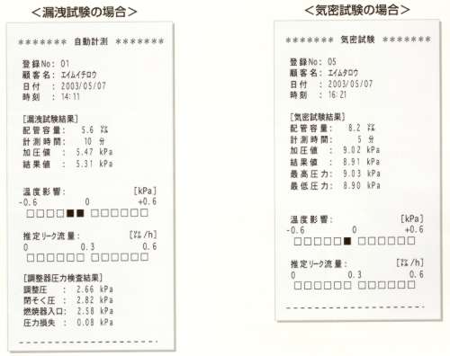 ▲従来の検査で圧力低下があれば温度が漏えいか判断に迷った結果・・・ ●再検査 ●後日、再検査 ●経験や勘で判断する という 方法がとられています。 しかし、危険物なのに、このような方法でよいのだろうか? <温度補正> 温度計で温度を計測しても下記のように露出部分と地中や壁の中では温度に差があり、温度補正をすることは出来ません。しかも、配管内部の温度を計測する事は、事実上困難です。 ![]() 本器は温度を計測するのではなく、配管設備全体の圧力を計測することにより、温度変化による圧力への影響を予測します。 そこで本器はボイルシャルルの法則に基づいた全く新しい方法で温度補正を可能にしました。 漏えい試験結果は計測結果で圧力が下がった事を数字で表示していますが、温度影響測定で圧力の低下が計測された為「温度影響による圧力低下」と判断し、推定リーク量表示には漏えいなし(グラフの点灯無し)を表示しています。 ![]() ■サンプル ![]() 気密試験結果は計測結果で圧力が下がった事を数字で表示していますが、温度影響測定で圧力の低下が計測された為、「温度影響による圧力低下」と判断し、推定リーク量表示には漏えい無し(グラフの点灯無し)を表示しています。 ■携帯用プリンターによる印字サンプル ![]() ■オプション