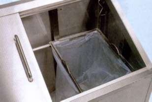 ステンレスSUS304 ●底には掃除や排水の為のフタがあります。フタの下には、トレーがありますので、床面を汚しません。 ●左右の扉それぞれにゴミ袋を取付が出来ます。 |