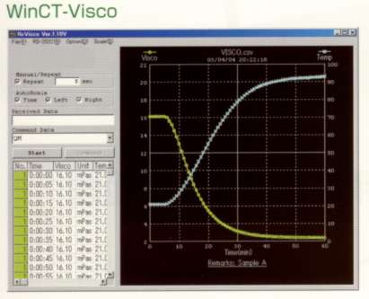 | ■特長 ●高い測定精度 新開発SV型(音叉型振動式)によるフルレンジ±3%/再現性1%の高精度を達成、また粘度の標準液を利用し粘度校正が可能。 ●広い測定範囲 振動子交換なしで低粘度0.3~10000mPa・sまでの広範囲の連続測定が可能。 ●正確な温度検出 粘度検出部(振動子)の熱容量が小さい為、温度平衡までの時間が短く試料の正確な温度測定が可能。 ![]() ●長時間の連続測定 振動子の熱容量が小さく、また測定時の温度上昇がないため、粘度の連続測定が可能。 ●非ニュートン流体の測定 薄型プレート採用の振動子により試料組織の変形が少なく、安定した粘度値と粘度変化に追従した測定が可能。 ●気泡入り試料の測定 振動周波数が30Hzと低い為、微小な気泡を壊さず、分散した大きな気泡には影響せず測定が可能。 ●流動状試料の測定 流動子の相互作用により、攪拌中の試料も測定が可能。また、流動状態となるラインなどでの利用が出来、ラボと同一データでの現場管理が可能。 ●流体試料における物性変化の連続測定 共振振動により高度な分解能を有しており、界面活性剤などの曇点測定および濡れ性などの測定が可能。 ●簡単な操作で短い測定時間 試料容器を粘度計にセットし、STARTキーを押すだけで数秒間で測定が可能。 ![]() ●測定データのリアルタイムグラフ化 測定データをパソコンへ取込み、リアルタイムグラフ化する専用ソフトWinCT-Viscoを標準装備。 ![]() ■仕様