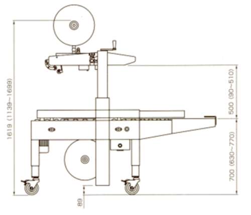 | ■特長 ●長い供給ガイドを装備し、作業位置に合わせて左右のどちらでも取付できます。 ●背の高いケースはサイドガイドローラーで安定封緘します。 ●サイズ調整は、幅・高さともハンドル調整で楽々。 ●独自のテーピングユニットでテープの通し方も楽々。 ●設置場所に合わせて左右の操作勝手の変更も楽々。 ●ベルト交換も新方式で楽々。 ●上テーピングユニット、搬入ケーブル等の付属品は各自取付です。