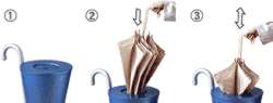 | ●初めての方も、使い方は簡単! 傘を差し込んで上下させるだけ。 傘についた水滴が、面白いくらいよく取れます。 傘をさし込み3〜5回上下させるだけの簡単な動作で、 傘についた水滴は驚くほどきれいに除去されます。 傘を傘袋へ入れるわずらわしさはありません。 お子さまやお年寄りの方にも楽しく使用していただけます。 *効果は、傘の構造や材質で異なります。