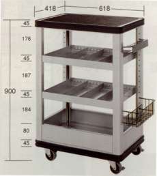 ●リーズナブルなオープン固定トレー2段 ●各トレーに3枚仕切り付で、トレーを有効に使えます。 ●各トレーの耐荷重 15kg ●耐油性に優れたウレタンキャスター75Ф自在車ストッパー付 ●質量 21kg |