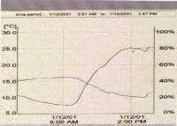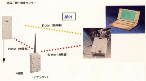 | ■特長 本システムは温度センサーにより水温及び地温の測定信号を無線でPCインターフェースに送信し専用ソフトがインストールされたパソコンに接続しデータの解析を行い、画面上にグラフや表が表示されます。 また、Excelにデータを移し日表、週表、月表を作成しプリントアウトもできます。尚、PCインターフェースは常時パソコンに接続していなくてもデータは蓄積されています。(32kb) データを吸い上げる時は接続して下さい。 ![]() ■記録間隔と(分)と期間(日)