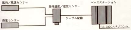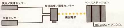 ■主な機能 ●風向/風速 ●屋外温度/湿度 ●温内温度/湿度 ●雨量 ●気圧 ●体感温度 ●露点 ●天気予報 ●アラーム機能 ●日付/時刻 ●電波時計 ■無線方式(微弱電波) ![]() ■有線方式(電話ケーブル) ![]() ■パソコン画面 ●ソフトウェア動作環境 Win95/98/NT/Me/2000/XP対応 Excel搭載 シリアルポートRS-232C ![]() ■仕様