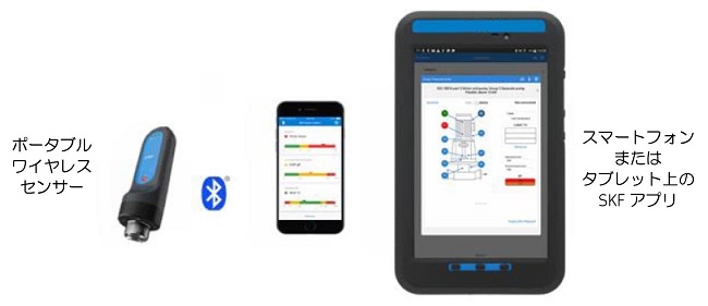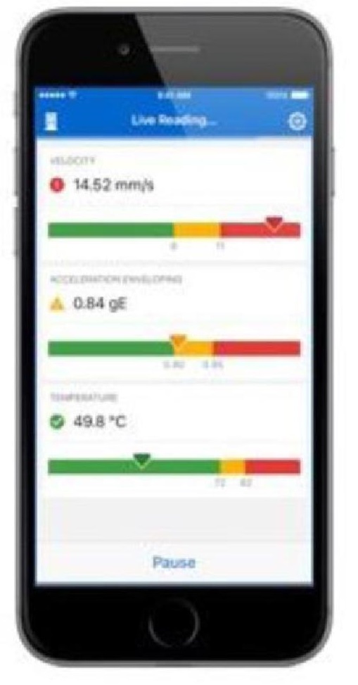 ![]() ■センサーシステム概要 巡回データ収集プログラムの1つとしてサービス、信頼性、操作、保守作業にお使いいただけます。1台の振動・温度センサー をタブレット、スマートフォン、スマートウォッチにワイヤレスで接続して1日に何百台、1ヶ月に何千台もの機械を監視できます。収集したデータは、その場でリアルタイムに分析することも、クラウドに送って後で解析することも可能です。 ![]() 一般的な操作手順は次のとおりです。 ●回転部品(ポンプ、ロータなど)を搭載した機械のところにセンサーとスマートデバイスを持っていきます。 ●マグネット式の取付台を使用して、軸受ハウジングにセンサーを取り付けます。 ●スマートデバイスのQuickCollectアプリまたは DataCollectアプリを起動して、無線(Bluetooth@ LowEneryEセンサー測定を開始します。 ●測定できたら、センサーを取り外して次の機械または測定箇所に移動して測定を継続します。 ●すべての測定が完了したら、ケーブル付き充電器にセンサーを戻します。 ![]() QuickCollectセンサーは、Bluetooth@ ow Eneg e.4.2を使して一般のOS端末およびAndroid端末と無線で通信し、QuickCollectアプリまたは DatCollactプリで機械の振動(速度、加速度エンベロープ、時間波形、温度に関するオーバーオールデータを収集します。 QuickCollectセンサーはワイヤレスでデータの転送が可能です。堅牢な設計で充電式電池を採用しています。ケーブルを省くことで作業者の危険と手間をなくし、安全性を高めました。現場での機械の状態監視に適した安全で迅速かつ使いやすいシス テムです。収集したデータはQuickCollectアプりまたは DataCollectアプリに送信され、分かりやすく色分けした棒グラフでアラームステータス(緑:問題なし、黄:警告、赤:危険)が表示されます。 ![]() ●QuickCollectセンサーキットは次の部品で構成されます。 ・QuickCollectセンサー(部品番号CMDT390)1台 ・電源CMAC 8007多国対応プラグ付き 1台 ・マグネットMM-8 1個 ■機械の状態監視 ●振動 問題がある機械は多くの場合、過剰な振動を伴います。振動を測定すれば、機械部品の緩み、偏り、軟弱な基礎、位置合わせ不良、ロータの曲がり、軸受の摩耗、 ギアの不良、ロータベーンの破損などすべて見つけることができます。 QuickCollectセンサーは、2種類の振動データと温度データを同時に測定可能です。 測定を実行すると、センサーの振動入力信号を処理して、重要な2つの振動測定値を測定点ごとに出力します。 ▶速度 機械に問題があると多くの場合、低周波数域から中周波数域で正弦波 の振動信号が生成されます(偏り、軸の曲がり、緩みなどの場合)。この周波数域で正弦波の振動信号を検出する振動速度の測定は、機械の問題を発見するた めの「一般的」な手法であるといえます。速度を基準とした振動のシビアリティに関する一般的指針がIS0規格で定められています。 ▶加速度エンベロープ 転がり軸受に不具合があると、振幅の小さい衝撃振動 信号が一定の周期で繰り返し発生します。一般に、振動速度の測定による監視 では、このような低エネルギーの衝撃信号は、周囲の機械における偏り、位置 合わせ不良、緩みなどで発生する振動音でかき消されてしまいます。加速度エ ンベロープの測定では、周囲の機械の振動音が排除され、転がり軸受やギアの 不具合により繰り返し発生する振動信号の衝撃特性が強調されるため、より短 時間で正確に軸受の不具合を発見できます。機械全体の振動監視ではなく、軸 受やギアの不具合をばらつきなく短時間で見つけることに適した手法です。 ●温度 温度は、特定の部品の機械的状態や負荷を表す有用な指標です。軸受や潤滑に問題 があると、摩擦が生じて温度が上昇します。軸受内部の温度変化を測定すれば、早 期に問題を発見して、費用のかかる重大な故障が起きる前に保守計画を立てること ができます。 温度測定センサーの開口部は、埋め込みマグネットの横にあります。測定対象の機 械から4cm離れた位置で、赤外線センサーが素早く温度を測定します。 ![]() ■制御部・機能 ![]() ①電源ボタン ②バッテリーLED ③通信LED ④汎用チェックLED 電源ボタン-センサーのON/OFFボタンです。FFの状態で押すとすぐに電源が入ります。 ONになると15分間の無操作オフタイマーが作動します。センサーとQuickCollectアプリまたはDataCollectアプリ間との通信が15分間検出されないと自動で電源が切れます。 ONの状態で3秒未満いずれかのボタンを押すと、無操作オフタイマーはリセットされます。 ONの状態で3秒以上電源ボタンを押すと、電源が切れます。 ●バッテリーLED-(緑色、赤色) 緑色-フル充電されています。電源に接続されています。 赤色(点灯)-充電です。源に接続されています。 赤色(ゆっくり点減)-充電量が少なくなっています。フル充電時の約15%の残量です(詳細は未定)。 赤色(高速で点滅)-充電量が少なく、センサーに電源を供給できない状態です。自動で電源が切れます。 ●通信LED-(緑色