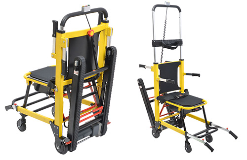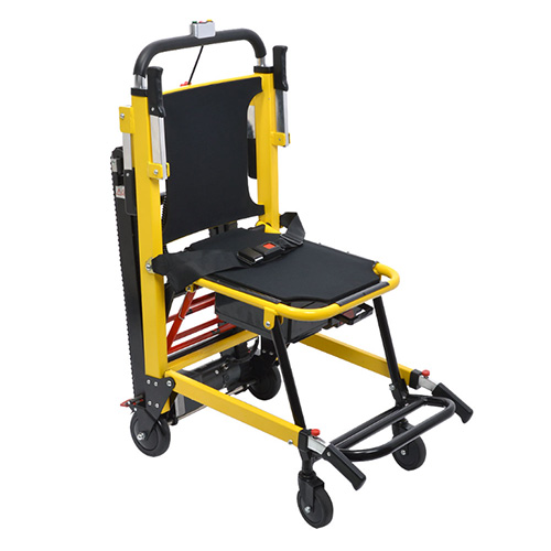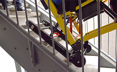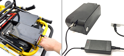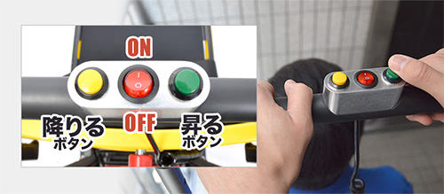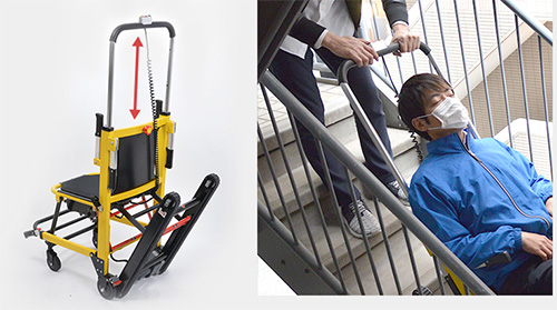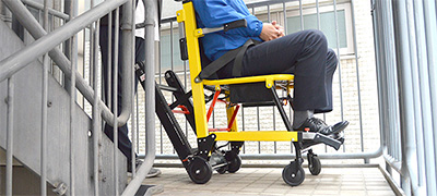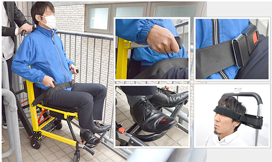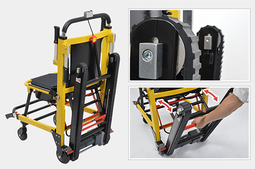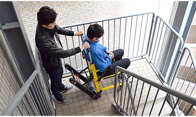 人を椅子に座らせて、電動で階段を昇り降りできる車イス型電動昇降車です。![]() ■製品概要 電動で階段を昇り降りできる車イス型の電動昇降車です。 乗せられる人の最大積載量は160kg。 車椅子の背面についたゴムキャタピラが階段をしっかりつかみ。安定した昇降を実現。 手元の操作ボタンで簡単操作。 角度35度までの階段を、約28段/分のスピードで昇り降りすることができます。 バッテリー式で、連続使用時間80分。使用しないときは折りたたんでコンパクトに収納できます。 ![]() ■階段をしっかりつかんで昇降するゴムキャタピラ ![]() 車椅子の背面にあるゴムキャタピラの凸凹と滑りにくいゴムが、階段をしっかりつかみ、段差でも昇り降りすることができます。ゴムキャタピラ全体が階段に接地するように車椅子を傾けて進みます。 ![]() 階段の最大角度は最大35度で、走行スピードは、昇り8.6m(約28段)/分、降り9.0m(約29段)/分。1分間に約28~9段進めます。 ![]() 車椅子を移動するハンドルは、3段階で伸ばすことができ、屈まず立って階段を昇り、安定して人を運ぶことができます。 ![]() 平地の場合、キャタピラを付けずに4つの車輪で手動で手押しする事ができます。 ■最大160kgまで。人を安全にのせる。 座席にはシートベルトがあり、アームレスト、足置き、そして、必要であれば頭固定ベルトを使って、安全に人を乗せることができます。 乗せることができる最大積載体重は160kgです。 ![]() ■コンパクトサイズで小回りがきく ![]() 大きさは、標準的な車椅子よりスリムで、マンションなどの細い階段や踊り場でも移動できます。 ![]() 上画像の踊り場の広さ縦100cm×横200cm ■手元で車いすの昇降を簡単操作 ![]() ハンドル中央にゴムキャタピラを操作するコントローラーがあります。コントローラーには、「昇降電源ボタン」「昇るボタン」「降りるボタン」の3つのボタンがあり迷うことなく操作ができます。 主電源が入った状態で、「昇降電源ボタン」をONすると動かせる状態となります。 「昇るボタン」「降りるボタン」は押しつづけると走行ベルトが動き出します。 ボタンを押し続けたときだけ動くから、離せばすぐにその場で安全に停止します。 ■バッテリー充電式でコードレス ![]() 座席下のバッテリーを取り外して、充電することができます。 充電時間は約3~4時間で、満充電から使用すると約80分※と長時間の動作が可能です。 ※80kgの荷物を載せた場合 ■仕様