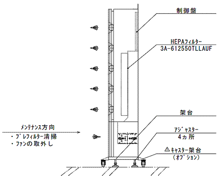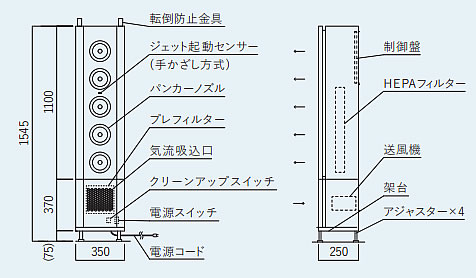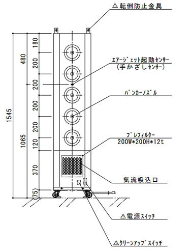 | スリムワイド:350mm 安価でメーカー最安値 風速25m/s ![]() ■簡易クリーンブースとセットで ![]() ■作業室の入口に ![]() ■商業施設の入口に ![]() ■使用環境 その他 EV内のクリーン化 クリーンルーム建設時の前室 生産工場事務棟の風除室 学校内の給食室入口 荷捌室入口 ホテル、マンションにて花粉症、PM2.5対策 AS室への設置 ■寸法図/各部名称 ![]() .![]() ![]() ■仕様