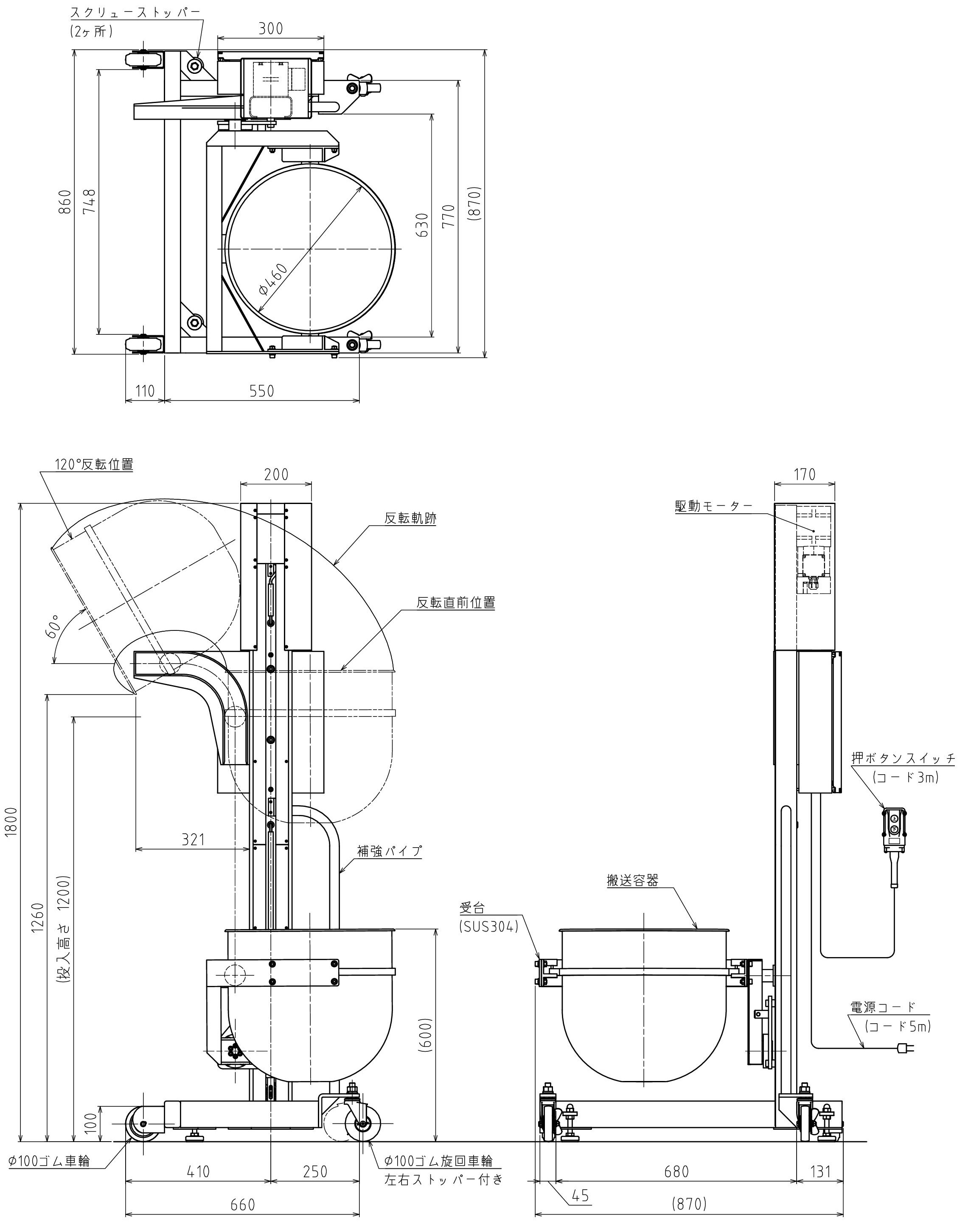 小型材料反転投入リフター60kg投入高さ1200mm(ステンレスボール容器)
