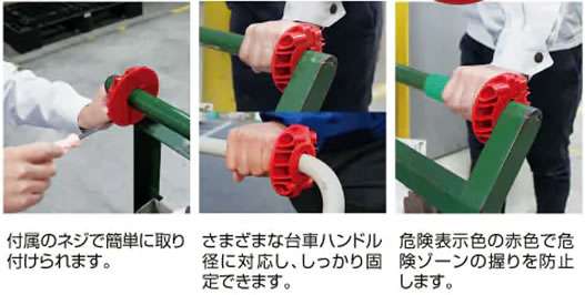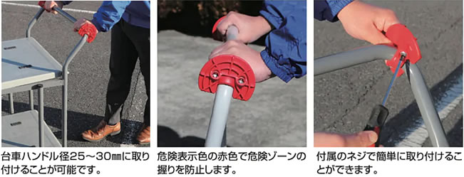 | ●台車ハンドル部での指挟み対策として最適です。 ●危険な台車ハンドル角部での操作を制御し、内側を握る安全ルールを作ります。 ●付属のネジで簡単に取り付けられます。 ●さまざまな台車ハンドル径に対応し、しっかり固定できます。 ●危険表示色の赤色で危険ゾーンの握りを防止します。 ![]() ■用途 台車、カゴ車、ツールワゴンなどのハンドル安全対策 ![]() ■特長 ![]() ![]() ■寸法図 ![]() ■仕様