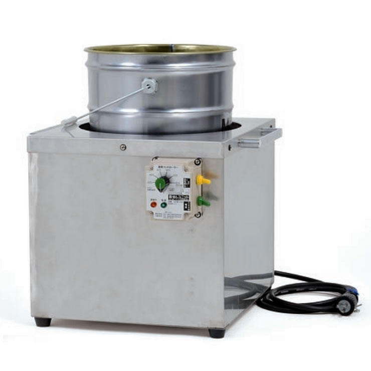 | ●本機は「一斗缶」「ペール缶」専用の湯せん式加熱工具です。 ●お湯で容器を温めるため、容器を均一に加熱することができます。 ●本機には温度調節機能の他に過昇温防止機能も付いており、安全にご使用いただけます。 ![]() ■アプリケーション ●容器に入った高粘性液体・凝固物の取り出し、保温を行うためのヒーターです。 ■安全にご使用いただけます。 ●容器を温める際は、必ず容器のキャップをはずしてから温め るようにしてください。容器内部の空気の膨張により容器の 破裂や蓋が吹き飛ぶなどの事故になります。 ●水以外の液体を水槽に入れて加熱しないでください。故障の 原因になります。 ●揮発性・引火性物質の加熱はできません。 また、周囲にそれらを置かないでください。火災や爆発などの原因になります。 ●使用しない時は、電源スイッチをOFF側にしてください。 また、長期間使用しない場合は電源プラグをコンセントから抜いてください。 ●使用前に必ず電源電線や本体の周囲を点検してください。 火災・感電・火傷の恐れがあります。 ●本製品を改造したり、分解したりしないでください。 ●樹脂製の容器を温める際は、温度設定を 40℃以下にしてください。 40℃よりも高温で加熱しますと、樹脂容器が変形し、中の液体が漏れ出す恐れがあります。 ●本ヒーターは屋内用です。屋外では使用しないでください。 ■タイプ