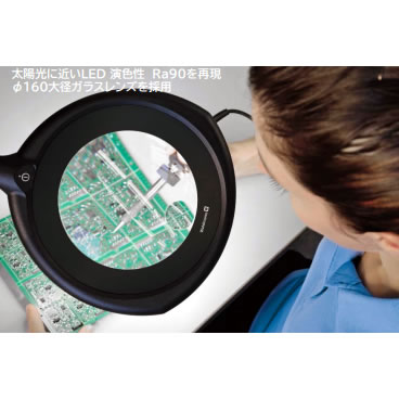 | 目に優しいレンズ付き検査照明 研究開発室、電子基盤の組み立て、検査、金属加工の仕上げ面検査、時計、精密機器の組み立て、フットケア、まつげのエクステンション等で威力を発揮します。 スマートで優雅なデザインに秘めた、その高いパフォーマンス。 高品質を保つためのレンズ付き検査ライト。 ![]() ●プレミアム SMD-LED 48個搭載 ●40%の省エネルギー設計 ●14Wで6,000lxの達成 ●メンテナンスフリー LED寿命は50000時間 ●連続調光100% to 10% ●3Dシャドウ効果 ●演色性 Ra>90 クラス1A ●3.5ジオプター(1.875倍) ●傷防止強化ガラスレンズ ●150mmワイドレンズ(ひずみ無しは範囲は120mm) ●アームはアルミと強化プラスチックから構成された軽量設計 ●間接部分はシール構造。内部ケーブルを保護しコンタミの流出入を防止 ●超フレキシブルな間接設計 ●バランスを取ったアーム設計で位置決めが容易 ![]() ■人間工学を考慮した操作性と品質 目に優しい、ひずみの無いレンズを採用しました。 φ120内がひずみのない領域です。(一般的な人間の両目の間隔は約70mm程度と言われています。) 本体は2.6kgの軽量設計、アームは容易に動かすことが出来、簡単に位置決めができます。 拡大レンズは傷の付けにくい強化ガラス製を採用。 ほこりの付着、事故防止のため、レンズキャップを標準付属。使用時にはアームに固定できる紛失防止構造です ![]() ■検査用 超高品質LEDライト 100%~10%までの調光が可能。3Dインスペクションに必須のビジュアライザー機能は、照射角度を変更し、検査品を見やすくします。 スイッチ1つで、3タイプのLED光源を設定でき、ワークの形状性質に伴い切り替えることが出来ます。 最高品質の演色性Ra=90,クラス1Aを誇る検査用ライトの最高峰。 3.5ジオプター(1.875倍)が標準ですが、オプションで8ジオプターを追加し、合計11.5ジオプター(3.875倍)にすることも可能です。 ![]() ■フレキシブルなヘッドジョイント アームジョイント部はフレキシブルな位置決めができます。 特にヘッドジョイント部分は3方向にジョイントを設け、各±90°の位置決めを行えるようにしました。 画期的なスイベルジョイント(6箇所)で様々な姿勢に対応します。 ![]() ■LEDによる省エネ設計 メーカー従来品(蛍光灯)と比較し、40%の省エネを実現しました。(27W→14W) また、LEDライトの寿命は50000時間(5.7年間)。 1日に12時間使用するとして、約11年使用できる計算になります。 ![]() ■ARコート(Anti-reflective coating)とは レンズやディスプレイなどの表面に施されている反射防止処理のことです。 室内照明や太陽光などの外光をレンズへの映り込みを防止します。 注意:標準レンズとARコートレンズと選定出来るようになっております。 ご注文の際は上記商品コード又はAR(反射防止)レンズとお申し出ください。