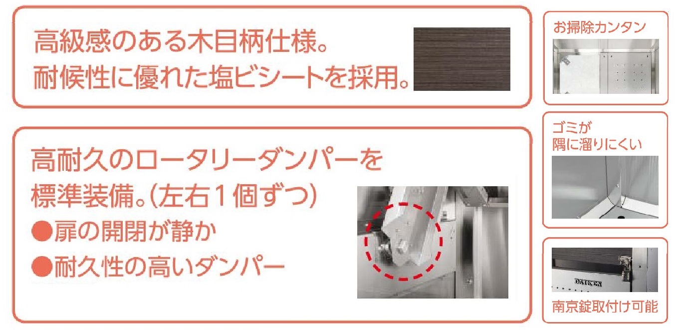 | ●回転扉と前パネルが上質で美しい木目柄のゴミ収集庫。 ●景観と調和する柔らかなデザイン。 ●内側からレベル調整が可能。(高さ調整範囲は0〜40mm) ![]() ■特長 ![]() ●高級感のある木目柄仕様。 耐候性に優れた塩ビシートを採用。 ●高耐久のロータリーダンパーを 標準装備。(左右1個ずつ) ・扉の開閉が静か ロータリーダンパーの搭載により、 開閉音約25%低減。 (ロータリーダンパー非搭載時と比べた場合) ・耐久性の高いダンパー 10万回の繰り返し開閉試験に合格。 ※回転扉の開閉を1世帯当たり8回/週行うと仮定すると、 約20年相当の開閉数になります。 ※耐久年数を保証するものではありません。 実際の使用環境・使用頻度により耐久性は異なります。 ●スペースを有効活用する扉 上扉は回転式で、本体内部に扉が納まり、上部分のスペースを有効活用できます。前扉は前面にスペースがなくても開閉できるオリジナル機構の上下スライド式扉。前扉と木目シートは擦れない設計です。 ●南京錠取付け可能 仮ロック機能付きの掛け金で、市販の南京錠の取付けができます。指定日以外のゴミ捨てや、いたずら防止に効果的。(南京錠は付属していません) ●ゴミが隅に溜りにくい 塵溜り防止板によりゴミが隅に溜りにくい構造です。 ●お掃除カンタン 底板は取外しが可能です。底板を取外して底板や地面の掃除が簡単にできます。 ■タイプ