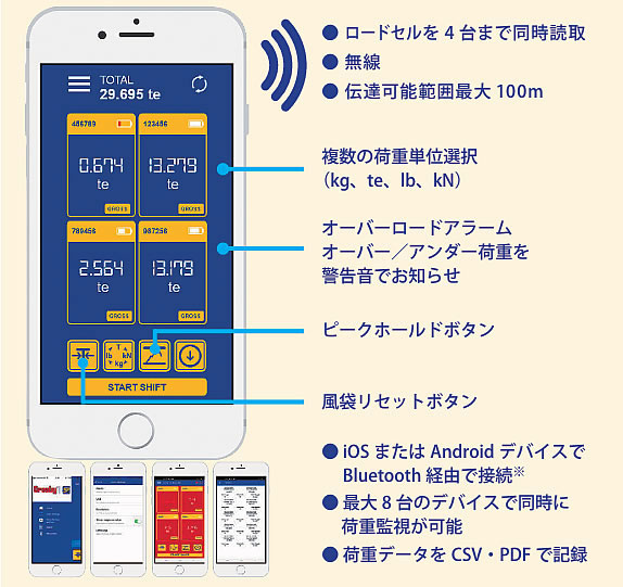 Bluetooth 版ロードセル 6.5 トン用![]() ■特長 ●超軽量、コンパクト設計 自重 1.5kg ●Bluetooth 無線通信 ●航空機グレード高品質アルミニウムボディ ●精度フルスケールの± 0.2% ●防塵、防水等級 IP67(NEMA6) ●鋭利な角がない曲線デザイン ■HHP ディスプレイアプリ ![]() ※HHP2ディスプレイアプリの対応OSは iOS6.0 以 降 また は Andorid4.4 以 降 の バージョンです。 スマートフォンは iPhone5以降の端末を 推奨します。 Androidの場合、Samsung社製 (BLE 通信に欠陥あり )を除くほぼ全ての端末でご利用いただけます。 ■寸法図 ![]() ■仕様