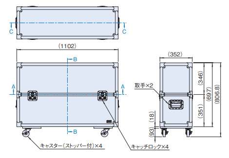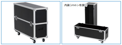 大型ディスプレイパネル等の運搬や保管に適したフルカスタマイズ対応のトランクケース![]() ■特徴 ●高強度で超軽量な樹脂のハニカムコア材を採用することで軽量かつ堅牢なトランクケースを実現しました。 ●キャッチロックでフタを着脱できます。 ●底面には、ストッパー付のゴム製キャスターが付いています。 ●2人でハンドルを持って、持ち上げることができます。 ●内部はメルトン布張り仕上げになっています。 ●RoHS対応となっており、環境や人に対して有害な危険物質が含まれている塩ビなどの材料を使用しておりません。 ![]() ■外観寸法図 ![]() ![]() ![]() ■仕様