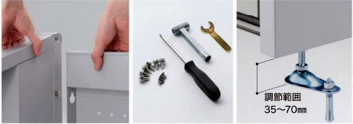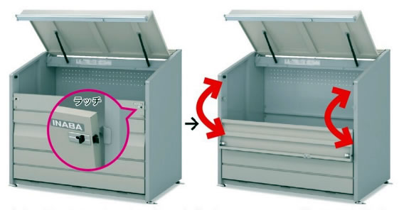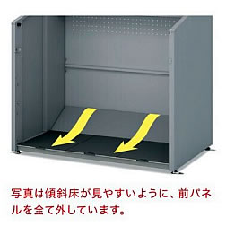 ■優れた換気機能 前方と後方に設けた換気口で空気を通し、嫌な臭いを軽減させます。 ![]() ■簡単組立&がっちり固定 組立工具付きで簡単に組み立てできます。また、アジャスターはアンカー固定に対応しています。 オールアンカーは市販品をご使用ください。 ![]() ■ゴミは取り出しやすい工夫(M1891CN-****タイプ専用機能) 奥行が深いM1891CN-****タイプはゴミの収集がしやすいように前パネル上部がラッチ開閉式となっています。ラッチの採用により開閉操作が簡単です。 ![]() ■奥のゴミが取り出しやすいように、傾斜床を採用しています。 写真は傾斜床が見やすいように、前パネルを全て外しています。 ![]() ■タイプ