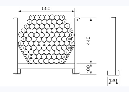 φ48.6単管を100本結束するための台です。![]() ■特長 ●頑強なアングル(L50×50×4)製です。 ●単管が安定した六角形に並び、本数確認も容易です ●リフトのフォークも楽に入ります。 ●耐久性に優れたドブメッキ仕上。 ![]() ■注意 ※必ず定数(100本)を下図のように並べ、鉄帯を掛けてください。 ※積み重ね、運搬、玉掛けはできません。 ■寸法図 ![]() ![]() ■仕様