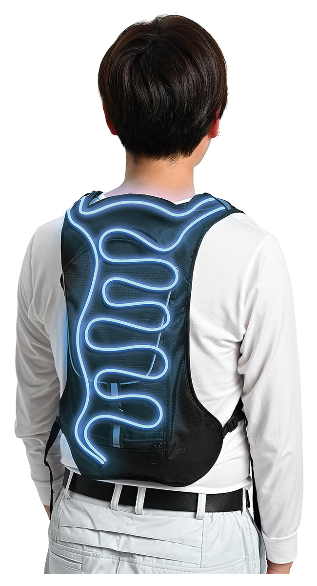 | ■特長 ●ポンプとタンクを分解せずに手洗いでき、組立の手間いらず ●首までヒンヤリを感じさせる冷却構造 ![]() ●氷などで冷やした水をホースに循環させ、身体を涼しくします ●実用新案登録出願済 ■裏(背中側)