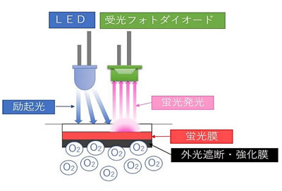 | ●高圧蒸気滅菌対応 (at 125℃ 30分) の堅牢な構造です ●煩雑な電解液の交換 を必要としない構造につき、保守作業の負担を軽減できます ●液体、気体、粉体、 静置流体、真空環境などの測定に対応可能です ●光学式酸素濃度計において業界随一のコ ストパフォーマンスを誇ります ![]() 青色LEDより紫外線がプローブ検出端の蛍光物質に照射されます。 この時、紫外線によって励起された蛍光物質は、蛍光を発して元の安定状態に戻ろうとします。 この現象は、蛍光物質内の酸素分子量が増加する程、反比例して蛍光強度が減衰します。 この蛍光強度の変化を電気信号に変換し、酸素濃度の測定を行います。 ![]() ■センサープローブはインライン型と投げ込み防水型の2種類ラインアップ ![]() ■アプリケーション ・培養液内の溶存酸素測定 ・粉体中や粉塵環境の酸素濃度測定 ・真空配管内の酸素濃度測定 ・各種気体・液体中の酸素濃度測定 ・土壌中の酸素濃度測定 ■変換器 仕様