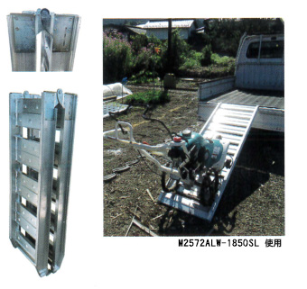 | 農業機械やバイク等を積載車へ積み込む際に便利です 幅広アルミブリッジスロープ(幅50cm×長さ180cm) 品番 M2572ALW-1850SLは、小型耕運機、自動草刈り機の搬入搬出に最適です。 ![]() ■タイプ ![]() ■使用例 ![]() ■仕様