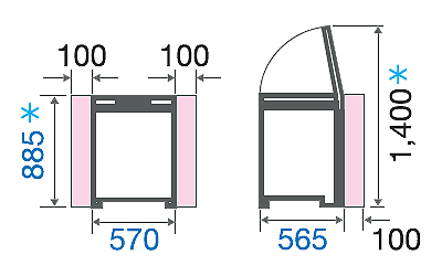 ※2:クイック冷凍設定時には、通常冷凍モードでの運転と比べて、約80%消費電力量が増加します。なお消費電力量は使用条件によって変化します。 ※3:庫内を早く冷やしたいとき、一度に多量の食品を入れた時に急冷スイッチを「入」にすると、コンプレッサーが連続運転となり早く温度が下がります。クイック冷凍から24時間後には自動終了します。 ※4:手動での霜取り方法については、取扱説明書をお読みいただき、正しく霜取りを行ってください。 ■据付必要寸法図 ■は最小必要設置スペースで年間消費電力量の測定条件での寸法とは異なります。 *キャスターを含む寸法。上部は扉が前回できるスペースをお取りください。