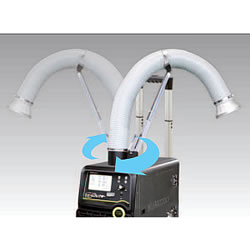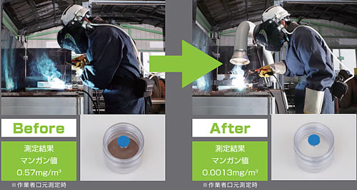 | 100V電源で電源確保しやすい 「溶接ヒューム」が特定化学物質になりました。 溶接作業者に対する発がん性や神経機能障害等を及ぼすおそれがあるため特定化学物質障害予防規則(特化則)の改正により、新たに特定化学物質に追加されました。 ![]() ■工具レス構造 工具レスでダストボックス内の処理やフィルター交換ができます。 ![]() ■W火消し構造 火花の本体内への流入を防ぎ、内部フィルターを保護します。 ※火花の完全抑制を保証するものではありません。 ![]() ■疲労軽減構造 移動が簡単にでき、運搬時の負担を軽減します。 ![]() ■吸熱構造 風路を長くとることでスパッタの熱を奪うことが可能です。 スパッタが下層に蓄積し掃除簡単です。 ![]() ■スイングアーム 吸込み方向360度旋回、伸縮可能です。 保持アームで位置固定が簡単にできます。 ![]() ■タイムカウンター 稼働時間を積算し、フィルター交換やメンテナンス時期の目安に使用可能です。 ![]() ■99.8%改善、作業者周辺の溶接ヒューム削減に効果的 測定結果により溶接ヒュームの濃度がマンガンとして0.05mg/m3以上の場合には、換気の増加、作業方法の見直し等必要な措置(集じん装置による集じん又は移動式送風機による送風の実施)を講じることが義務付けられています。 ■接続作業現場の接続ヒューム測定 空気中のマンガン濃度がマンガンとして0.05mg/m3を下回らせる必要があります。