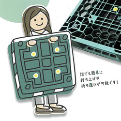 | 100%リサイクルのプラスチックパレットです。 こころ和む緑の色彩、色別のご使用に最適です。 メッシュ形状により風通しよく清潔、またハニカム構造により強度アップ。 HACCPに沿った衛生管理に適しております。 11kgの軽量品、床汚染防止に有効です。 ![]() ■誰でも簡単に持ち上げや持ち運びが簡単です。 ![]() ■寸法図 ![]() ■製品仕様
