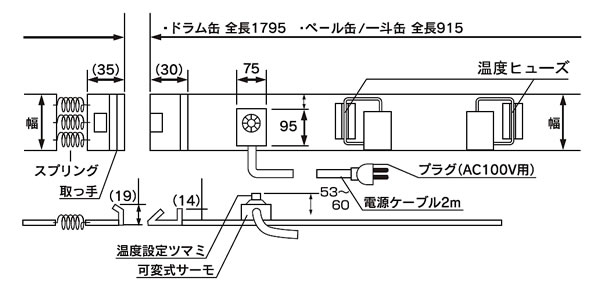 | ドラム缶用ヒーターと断熱ジャケット(3枚/セット)付きとなります。 面ファスナーで簡単に着脱できます。 缶の外側からしっかり断熱し、放熱を防ぎ、保温力を高めます。 ペール缶・一斗缶やドラム缶の固体、液体(アスファルト、オイル、塗料、チョコレートなど)の取り出しを簡単に行うために開発されたヒーターです。 脱着式の断熱ジャケットも付いているため、より安全にご使用いただけます。 ![]() ■特長 力をかけずに簡単脱着、持ち運びもラクラク。 業界問わず、四季を通じて使用できます。 温度調節機能付きだから、誰にでも使えます。 柔軟性・屈曲性・耐久性に優れています。 脱着式の断熱ジャケットも付いています。 作業中による火傷防止のほか、放熱を防ぎ、熱効率をUPさせることができます。 ![]() ![]() ![]() ![]() ![]() ■図面 ![]() ■昇温特性 ![]() ■仕様