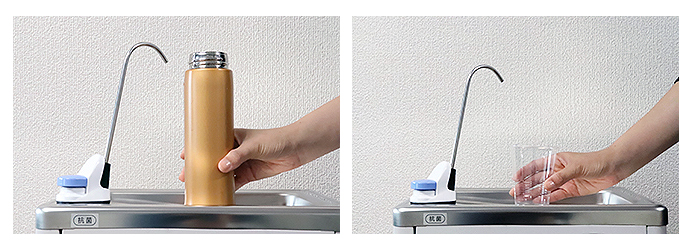 ※2:一人当たり1時間200cc使用するものとして算出(噴水式のため約40%は排出されます) ※3:周囲温度30℃、給水温度25℃ ※4:抗菌仕様について ■オプション ●グラスフィラーユニット ウォータークーラーにグラスフィラー(別名 補助蛇口)の取り付けを行うと、コップやペットボトル、水筒などへウォータークーラーから直接冷水を汲めるようになり、非常に便利になります。 ●高さが十分にあるため水筒・ペットボトルなどへ注ぐのにも大変便利です。また、容器の高さが低いものへ注ぐ場合もしっかり考慮しており、パイプ径の太い設計をおこなっておりますので、水のはね飛びを抑えております。 ※冷水供給能力は本体の性能になります。 ![]() ●簡単脱着式・ねじ固定式2WAYの対応が可能です。 清掃や洗浄などお手入れを楽にする「簡易脱着式」を採用しておりますが、 ウォータークーラーの蛇口を、同梱の付属部品と交換してご使用すれば外れにくい「ねじ込み固定式」にもでき、お客様のお好きな取付方法でご使用が可能です。 ![]()