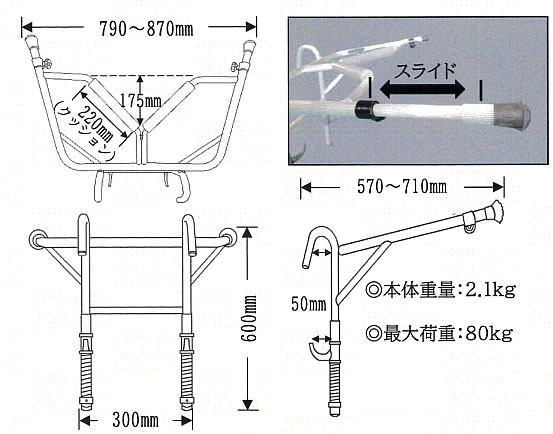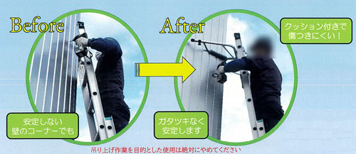 | はしご用アタッチメント はしご作業の緩和・安心・救援 ※はしごは付属しておりません。 ![]() ![]() ■使用例 ![]() ①センター部分がコーナー、円柱型にフィットするので安定性が増します。 ②ステップ間隔が25cm~35cm以内の一連、二連、三連バシゴにメーカー問わず取付可能 (ステップ部に補強がある物については取り付かない可能性があります。またハシゴ兼用脚立には使用できません。) ③ハシゴの先端が壁から離れふところスペースができ作業能率がさらにアップします ④アルミ製で軽量、ワンタッチで取り付けできハシゴと一体化 ⑤壁に当たる左右の間隔を広くし安定性もアップ。特殊ゴム使用で横滑りを防ぎます。 ⑥建物の外壁修理や雨どいのお掃除・看板等のメンテナンスや塗装などあらゆるはしご作業に大活躍 ⑦壁に当たる左右の足は最大15cmスライドするので凹凸のある場所でも安定します。 ■寸法図 ![]() |