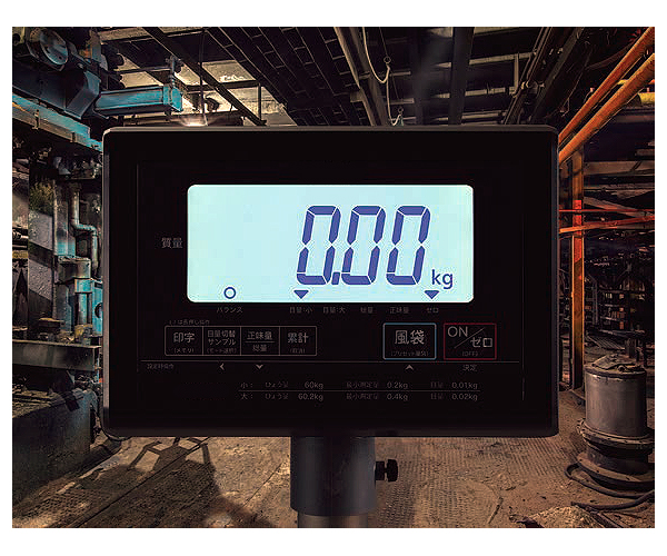 水や汚れに強い保護等級IP65の防水性能(指示部および計量部)。指示部には操作しやすい大きなボタン、視認性の高い文字高さ46mmの大型液晶表示を採用。