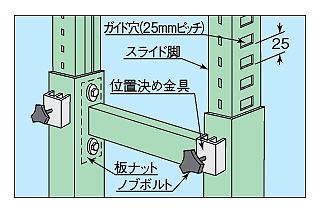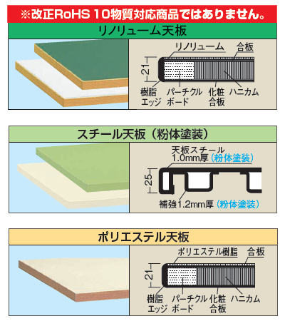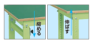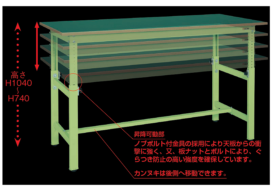 | ■特長 ●均等耐荷重300kgの軽量高さ調整作業台 ![]() ●本体は角パイプ(構造用鋼管)を使用しているため非常に堅牢でしかもホコリが溜まりません。 ●高さ740〜1040mmの範囲で25mm毎に高さ調整可能 ![]() ●上部伸縮自在 余裕のストローク(300mm)で作業内容に合わせた高さ変更ができます。 ![]() ●衝撃に強く、ぐらつきがありません ノブボルト付金具の採用により天板からの衝撃に強く、又、板ナットとボルトによりぐらつきを防ぎます。 また、スライド脚にはガイド穴が入っているので、高さ調整が簡単に行えます。 ![]() ●樹脂製のアジャスター標準装備 レベル調整が容易にでき、床を傷つけることもありません。 ![]() ■天板 ![]() ■タイプ