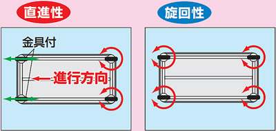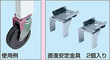 ■直進安定金具 移動式の作業台には、お客様の現場や用途に合わせて、キャスターの回転を止める金具の取付けを選ぶことができます。 ※金具の色は説明用です。実際はメッキ色になります。 ![]()