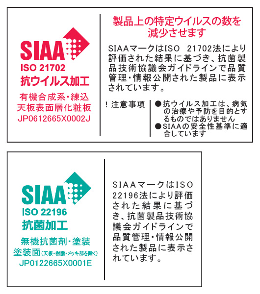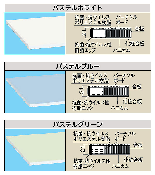 | ■特長 ●抗菌・抗ウイルス効果のあるパステル色の天板を使用した作業台です ![]() ●本体は銀イオンを配合した抗菌効果のある粉体塗装を採用 ●本体は角パイプ(構造用鋼管)を使用している為、非常に堅牢でホコリが溜まりません。 ●サイレントキャスター ラジアルベアリングによる高い静粛性と始動性。 従来比騒音レベルを10db低減。オフィス・病院・図書館などに最適 ![]() ●直進安定金具 移動式の作業台には、お客様の現場や用途に合わせてキャスターの回転を止める金具の取付けを選ぶことができます。 ![]() ※金具の色は説明用です。実際はメッキ色になります。 ■天板カラー ●白 清潔などのイメージを想起させる白はどんな色とも合う事が最大の特長です。また、気分を一新させる効果があります。 ●青 冷静さや爽快感を感じさせる色です。脈拍や呼吸数を減少させ、鎮静の効果もあります。 ●緑 安心感や情緒の安定、緊張の緩和効果を与えます。また、開放的で精神的にも疲れを癒し、リラックスさせる効果もあります。 ![]() ■タイプ