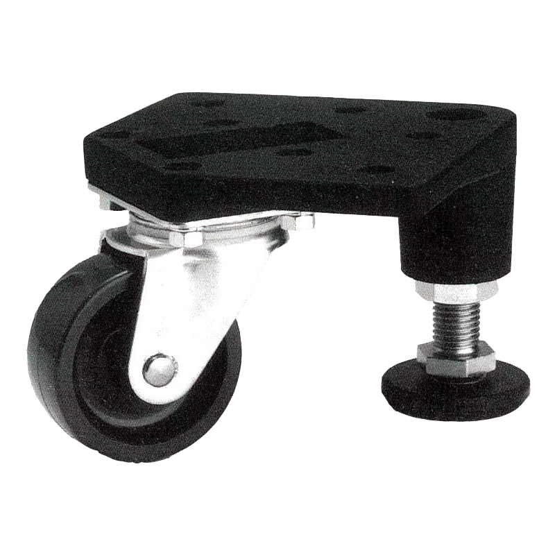 | ■特長 ●移動、固定、高さ調整を一体化構造。 ●振動、床の滑りを嫌う機器の足元に最適。 ●丸座は床に傷を付けない防振ゴム採用。 ●丸座とボルトの間にナイロンワッシャー使用でレベル出しスムーズ。 ●ご使用例(真空装置、各種検査機器、オーディオ等) ■材質 本体:アルミダイカスト ADC12 黒塗装(ツヤ消)、ネジ部は長ナットがインサートされています。 ジャッキボルト:SS400 ユニクロメッキ 丸座:カバーSPCC 浸炭焼入黒クロメート、 底部:EPゴム 車輪:ポリアミド樹脂(ジャッキボルトと座は一体化しています。) ■特性 耐衝撃性・耐摩耗性・耐油性(機械) ■強度 許容荷重の4倍ものテストをクリアしています。(丸座が防振ゴム仕様となっております。) ■寸法図 ■仕様