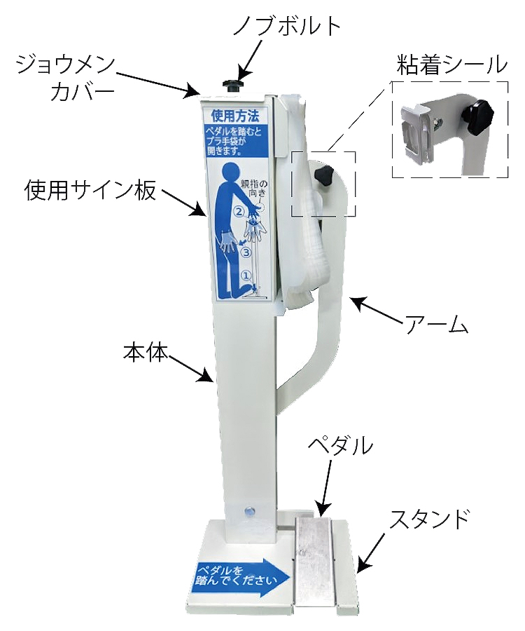 足でペダルを踏み、粘着シールでプラ手袋を開く事ができるため、簡単・ラクに手袋を装着でます。