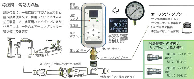 住宅の給水給湯樹脂配管、排水管、空調用ドレン配管などの漏洩検査が短時間で簡単![]() ■特長 ●あらゆる配管の圧力試験が水圧、空圧のどちらでも、最長24時間の圧力と温度の記録がとれる ●本体内に最大20件のデータ保存 ●住宅設備配管に空圧で、短時間に漏れ有無の判定空圧の検査は準備~撤収まで1人で簡単 ●従来の水圧試験に比べ、空圧を用いても滲むような水漏れによる微少な圧力変化を捉えます。 ●水道圧で、配管に負担をかけずに漏水点検が短時間で行えるので、リフォーム工事も安心 ■配管メーカー指定基準・社内基準に沿った圧力試験を任意に設定して合否を表示 ![]() ![]() ■漏洩判定に対応する配管種別 漏洩判定とは、「圧力検査判定あり」モードを選択した場合です。