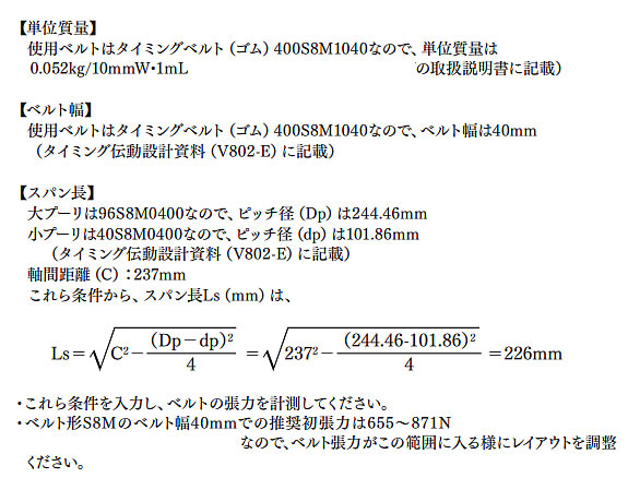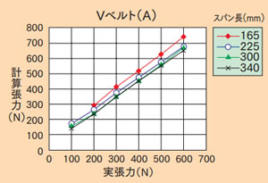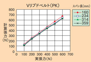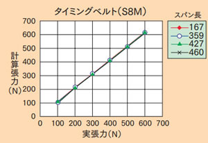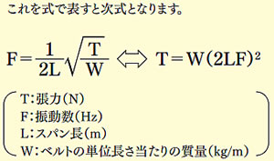 | ベルトの張力が一目で分かる 小型マイクでベルトの固有振動数を読み取り、瞬時にベルト張力を表示します。 まえがき 伝動ベルトが最高の性能を発揮するためには、適正な張力でベルトを張ることが肝要です。 伝動ベルトの張力管理にはぜひこの張力計をご使用ください。 ![]() ●豊富な測定可能対象ベルト タイミングベルト、平ベルト、Vベルト、Vリブドベルトなど、さまざまなベルトに対応できます。 ●ベルトの振動周波数および、張力値を同時に表示可能 2行表示により、周波数と張力値を同一画面で確認ができます。 ●広範囲な測定周波数領域 10.0~999[Hz](上位3桁)の広範囲な周波数領域を測定できます。 ●独自の高速データ処理により測定時間が短い 高機能ワンチップマイコンの採用、独自のデータ処理により短時間で張力測定が可能です。 (最短0.5秒) ●メモリー機能搭載 10種類の張力測定条件データ、および89種類の単位質量データが記憶できます。 ●オートパワーオフ機能を搭載 最終操作から5分経過すると自動的に電源が切れます。 これにより、電源スイッチの切り忘れ防止による電池の消耗を防ぎます。 ●日本語/英語の切り替えが可能 電源オン時に「0」と「Enter」キーを同時に長押しすることにより、表示を日本語⇔英語に切り替えることができます。 ■測定原理 ベルトを張った状態でドライバーの柄などで叩くと、一定の振動数で振動を始めやがて減衰します。 この現象はギターの弦と同じで、スパン長さは短かければ短いほど、張力は強ければ強いほど振動数は高くなります。 これは微分方程式で解け、その固有振動数は基本振動数の整数倍となります。 実際は速い振動はすぐに減衰し、基本振動数だけが残ります。 ![]() ドクターテンション®はこの原理を応用しています。 マイクロホンをセンサとして使用しているので、非接触で測定できます。 また、振動初期の不正な波を除き安定した振動数を表示するよう内部のマイコンが演算しています。 ただし、ベルトは、 ①曲げ剛性をもっていること ②振動している長さがプーリとの接点間距離より少し短くなること などにより上式からのずれが多少あります。 このずれはベルトの曲げ剛性が高いほど、またスパン長が短いほど大きくなります。 従って、正確な張力が必要なときは、あらかじめ実張力と振動数の関係を調べておくようお奨めします。 ※右のグラフは一例を示したものです。 ![]() ![]() ※計算張力:ドクターテンション®で測定した周波数を基に計算した張力実張力:ロードセルで測定した実際の張力 ■測定方法 1.必ず駆動装置の電源(スイッチ)を切り、ベルトが静止していることを確認する。 2.本器の電源を入れ、マイクロホンセンサをセットし、必要な測定条件を入力する。 3.スパンの中央付近に、ベルトとマイクロホンセンサを対面方向に向けて約10mmの位置に固定する。 4.ベルトの表面をドライバーの柄などで軽く叩き、ベルトを振動させる。 5.1.~4.を複数回繰り返し、本器が読み取った値の平均を記録する。 ![]() ■機能説明 小型マイクロホンセンサ ベルトの固有振動数を測ります。 ①フレキシブルアーム式 ②コード式 ※オプションとなります。