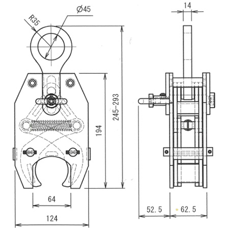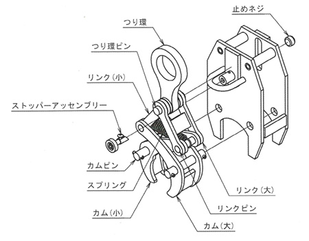 | 丸棒水平つり専用 基本使用荷重:0.5ton ![]() ■製品画像 ![]() ■特長 ●本クランプは、丸棒・パイプつり専用クランプです。 ●カムは開いたまま固定されるので取り付け、取り外しが容易です。 ●本体が薄いため狭い場所への使用が可能。 ■用途 ●指定寸法の丸棒・パイプつり専用クランプです。 ■使用上の注意 ●必ず重心を挟んだ位置に取り付けて水平にして使用してください。 ●2点つり作業の場合は掛け幅角度は20°以内で使用してください。それ以上の掛け幅角度が生じる場合は天秤を使用し範囲内で使用してください。 ●2mを越える長尺物のつり上げ作業は必ず2点つりで行ってください。 ![]() ■寸法図 ![]() ■仕様