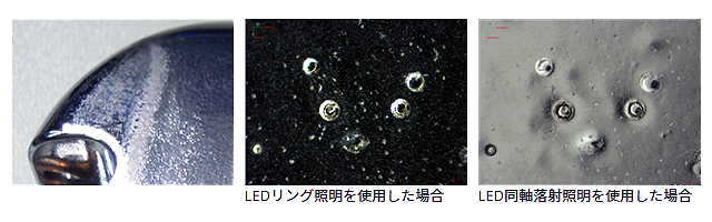 同軸照明を明視野照明(リング照明等)と比較すると得られる映像の違いがわかります。
