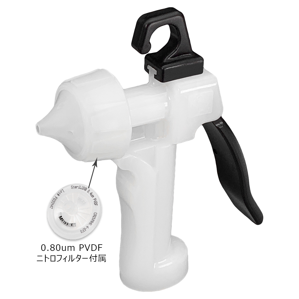 | N2ガスをはじめとする不活性ガスの使用を前提に作られたエアガンです。 ノズルは流体の均一な分散を提供するとともに、圧力排気機能により目詰まりによる過剰な圧力上昇を防止します。 ![]() ■特長 ●接液部は射出成型によるバージンPVDFと精密加工されたPTFEで構成されています。(0.80mmPVDFニトロフィルター付属) ![]() ●精密加工されたPTFEピストン/ポペットコンポーネントは、長寿命と確実なシールを提供します。 ●Оリングやエラストマーシールを使用していません。 ●ハンガーフックは着脱可能です。 ●ノズルは流体の均一な分散を提供するとともに、圧力排気機能により目詰まりによる過剰な圧力上昇を防止します。 ■流量と圧力の関係(0.80mm ミクロンフィルター) ![]() ■寸法図 ![]() ■仕様