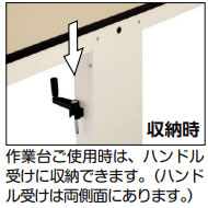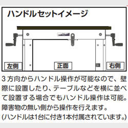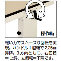 | ●進化したギヤ式昇降システムにより、スムーズな操作感、安定した昇降を実現 ●ご使用にあわせ正面・両側面の 3 方向 からハンドル操作が可能。 ハンドル受けは両側面に設置しており、作業時は 収納しておくことができます。 滑らかな操作感と堅牢な使用感を両立 ![]() ■3方向からハンドル操作が可能です。 設置場所での多様なレイアウトに対応します。